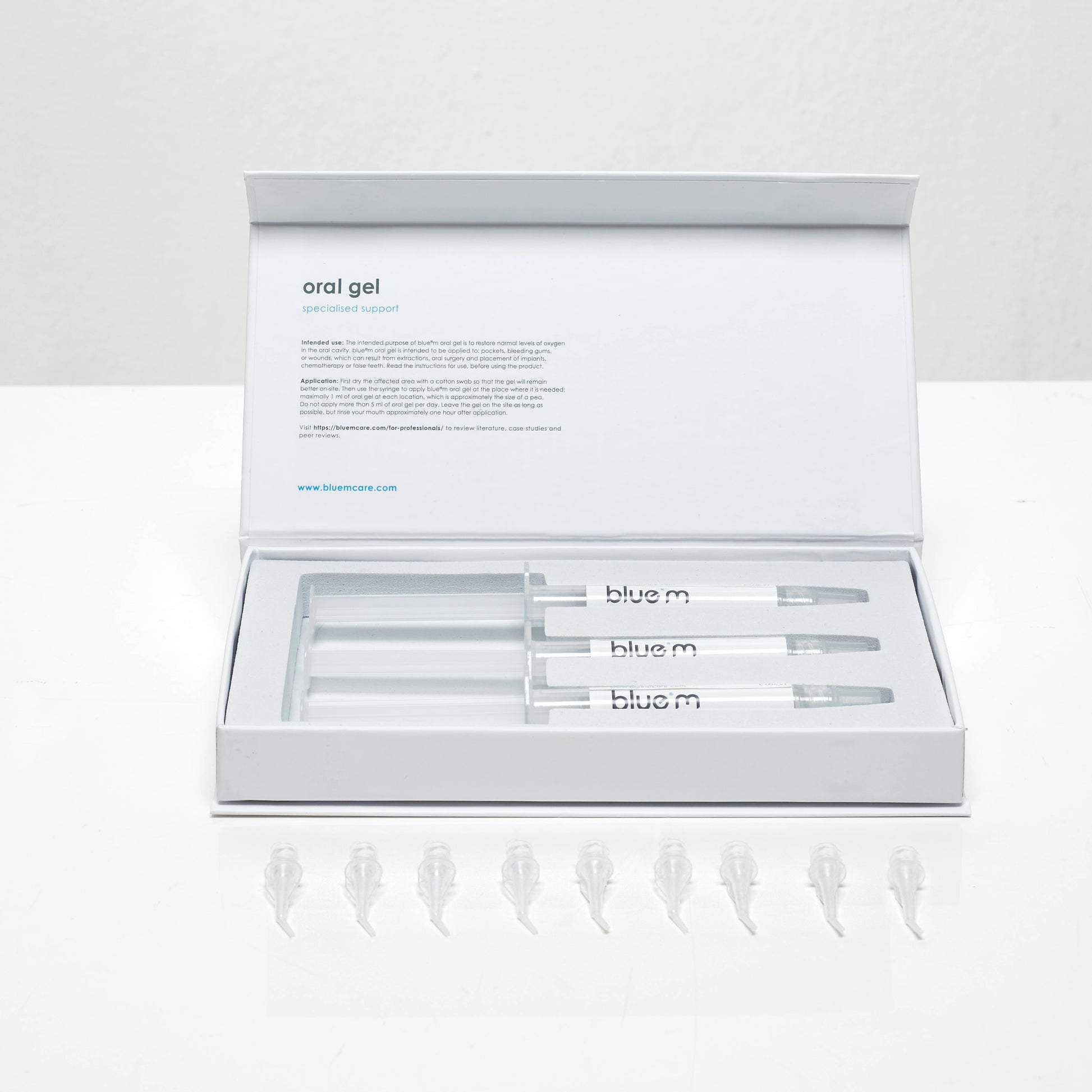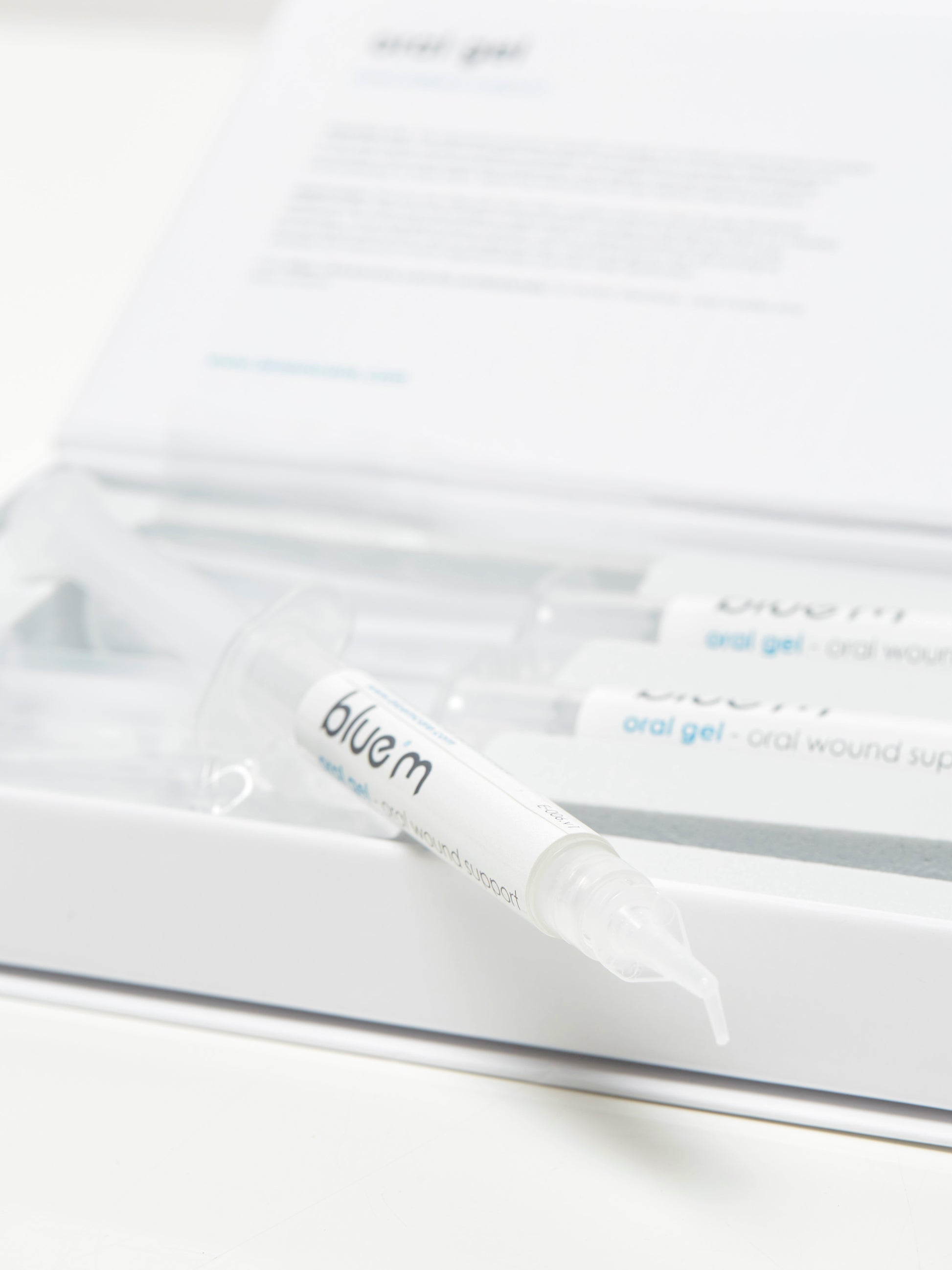 blue®m oral gel is speciaal ontwikkeld door een team van implantologen, kaakchirurgen en tandartsen. De gel bevat een hogere concentratie actieve zuurstof en verhoogt de zuurstofspanning in de mond. Dit versnelt de genezing van wonden in de mond, daarom noemen we dit wound support. De gel werkt effectief en versnelt de genezing van bloedend en ontstoken tandvlees (parodontitis), ontstekingen rond implantaat (peri-implantitis). Veel artsen adviseren dit product voor wondgenezing na het trekken van tanden en kiezen, na implanteren, bij een slecht zittend kunstgebit of na chemotherapie.