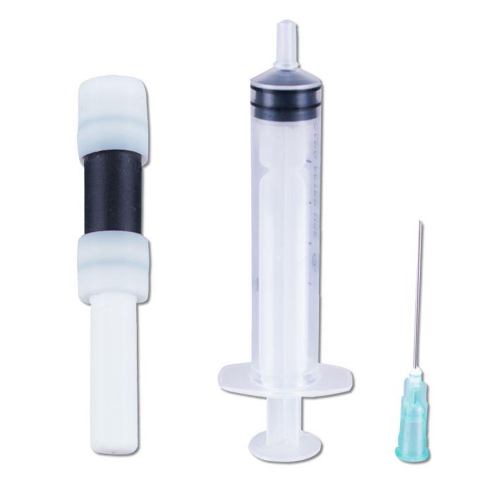 Zodra u het "OzoneDTA®"-apparaat hebt ingeschakeld, begint een stille ontlading, die de lucht in de ozontank ioniseert en omzet in ozon. Aan het centrifugaal geplaatste cilinderuiteinde bevindt zich een boorgat. Dit is in staat om het mondstuk van in de handel verkrijgbare injectiespuiten nauwkeurig te passen. Nu kunt u met een wegwerpspuit de ozon in het betreffende wortelkanaal of de betreffende gingivale pocket van uw patiënt richten.